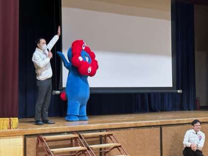 月曜日、なんとなんと育和小学校に、あの「ミャクミャク」が子どもたちに会いに来てくれました。以前ホームページでも紹介しましたが、実はこの夏休み、「おおさか子ども市会」があり、市内在住の小学5・6年生から多数の応募があるなか、育和小学校から3名の子どもたちが参加者メンバーに選ばれ、全体議長や代表質問などの役にもなって頑張ってきていました。
