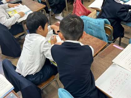 ?1年生の国語の時間。この日は「おとうとねずみチロ」で、おばあちゃんにありがとうの思いを伝える様子を読み取っていく学習でした。時に皆んなの前で、時にお隣の友だちと、またグループでめあてに向かって発表したり話し合ったりする姿に成長を感じました。