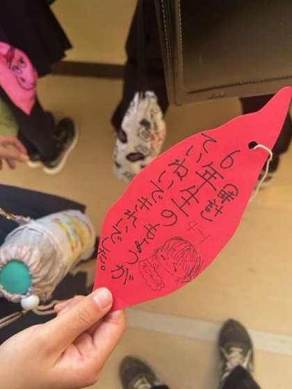 「育和の樹」。作品展が終わったあとも、折を見てどんどん、成長&広がりを見せていました。この数日後、放課後たまたま見に来た6年生が「あ、時計のこと書いてくれてる!めちゃうれしい!」と話していました。心は届き、つながっていきますね。