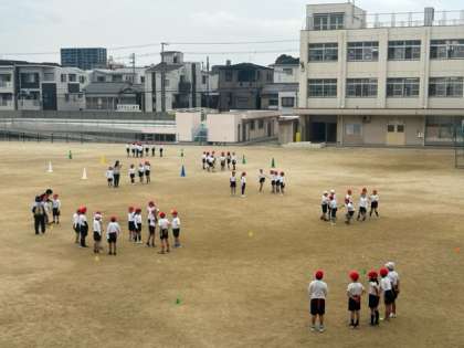 2年生、体育の時間です。これから、しっぽとり鬼ごっこが始まろうとしている場面。友だちと作戦を話したり、取られないように、どんな風に逃げようかと考えたり。わくわく、どきどきスタート直前の様子です。