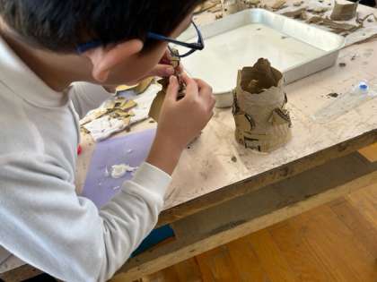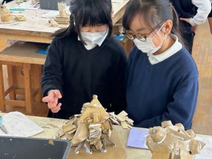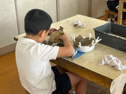 ダンボールを木工ボンドを溶かした水に浸して、柔らかくすると、普段のダンボール紙とはちがった表現ができます。初めはそれだけでビックリ!の子どもたちでしたが、この時間くらいになると、指先の操作や、洗濯ばさみを上手に使って止めるなど、表現の幅に広がりができてきました。そして、友だち同士で作品を見て会話をします。その言葉に新たなイメージのきっかけをもらったり、次なる意欲を高めたり。黙々と試行錯誤を重ねながら集中している姿を見ていると、時間はあっという間に過ぎていきました。