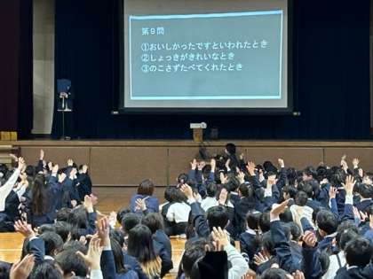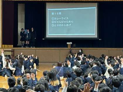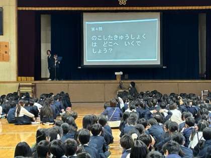 給食委員会の子どもたちが中心となり、給食集会が行われたました。給食について興味がわくようにと、いろんなクイズを考えて調査したり、調理員さんに聞いたりして準備し、食べ物の大切さをみんなに楽しく伝えてくれました。