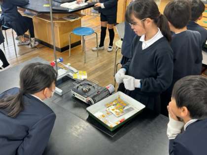 各班ごとに予想をたてて、いざ実験。「おー、こんな風にあたたまるんや」「予想通り!」と、友だちと話し合いながら進めていました。