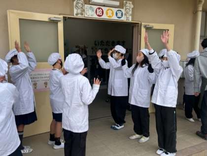 給食委員会さんたちの声かけで、ちゃんと手は洗いましたか?の確認のあと、今日も元気な「いただきます!」の声が給食室前に響きます。いつも安心・安全な給食の実施に向け、調理員の方々にご尽力いただいています。いつもありがとうございます。