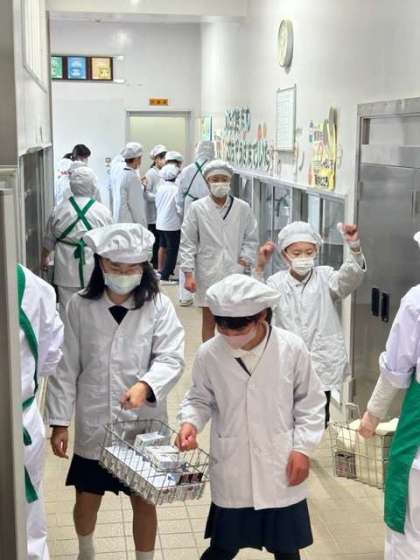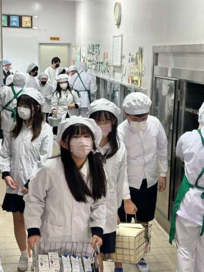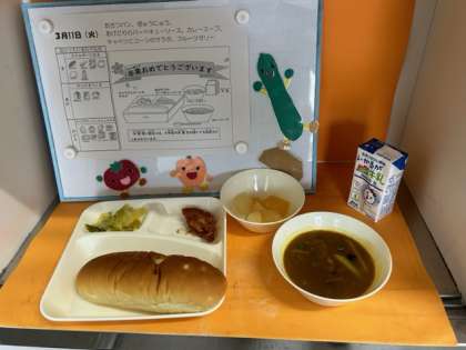 今日の給食は「卒業お祝い献立」でした。給食当番でやって来た子どもたちも「今日は、一品多いんやって」と嬉しそう。こうやって給食を食べられることに感謝して、「今日はみんなで6年生のお祝いやね」の気持ちでいただきました。