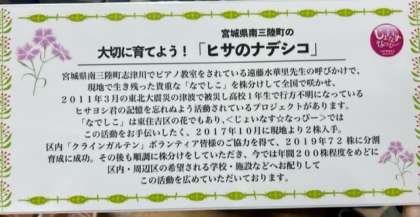 これは、宮城県のある先生の呼びかけで、東日本大震災の際に現地で生き残った貴重な「なでしこ」を株分けして全国で咲かせ、つながってきた苗です。また、「なでしこ」は東住吉区の花でもあり、2017年10月に現地より2株入手。区内ボランティアの皆様のご協力を得て、2019年72株に分割、育成に成功。その後も順調に株分けをし、今では年間200株程度をめどに区内・周辺区の希望される学校・施設などへお配りしていただいています。