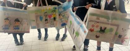 先日ランドセルを背負い、手に作品袋を持っていたのは1年生です。楽しかった思い出や大好きな絵がここでも描かれていました。