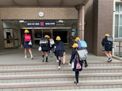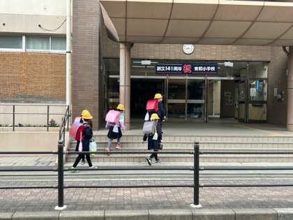 卒業式の次の日から、5年生が先頭になって、集団登校で「おはようございます」。次はみなさんが育和小学校のリーダーです。がんばってね、5年生!