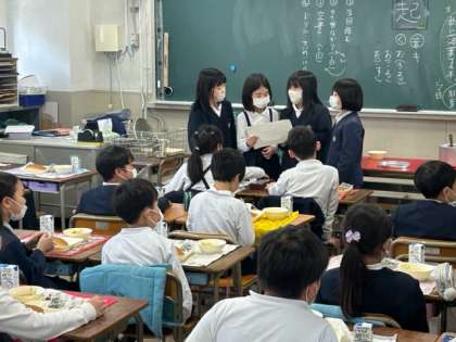 給食係の子どもたちでしょうか。声を合わせて、今日の献立を読み上げていました。さっそくのお仕事。周りの友だちも静かに聞いていました。
