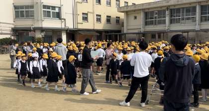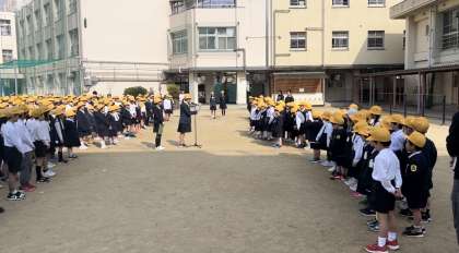 金曜日、新入生の対面式がありました。運動場の子どもたちも時間通りにスタンバイ。2列に並んで、ちょっと緊張の面持ちで入場してきた1年生を、6年生から2年生の子どもたちが、あたたかく拍手で迎えてくれました。