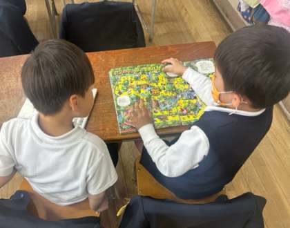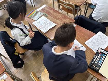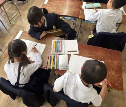 給食当番の子どもたちが給食室へ返却しに行っている間、教室ではどのクラスでも、自分の席で、絵本を読んだり、色塗りをしたり、中にはノートにオリジナルの「あみだくじ」を書いたりして過ごしていました。「それ、なあに?」「見て見て、これね・・・」と、穏やかな雰囲気のなか、近くの友だちと楽しそう。こうして少しずつ、友だちの輪が広がっていきます。