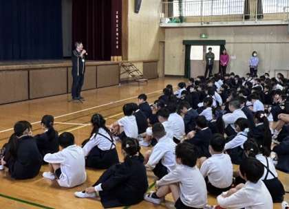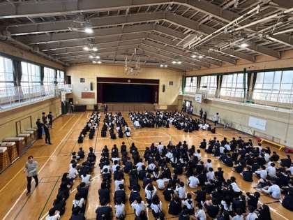 ?今朝の全校朝会は講堂で行いました。1年生は初めてでしたが、とても上手に並ぶことができていました。並ぶのを待っている間の上級生も、静かに座って待つことができていました。
