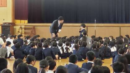 今朝の話題は「目標は決めましたか?」ということと、心をつなぐ「礼」の話でした。「通知票で、オール3になるといいな」「ぼくは、足し算をがんばります」と、全校みんなが集まる中で、マイクを手に、自分の目標を堂々と話せる子たちの様子に感心しました。そして終わると拍手を送ってくれる周りの子どもたちも、やっぱりあたたかでした。(せっかく手を挙げてくれたのに、全員当てれなくてごめんなさい。また教室に行ったときに教えてくださいね。)
