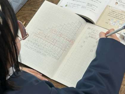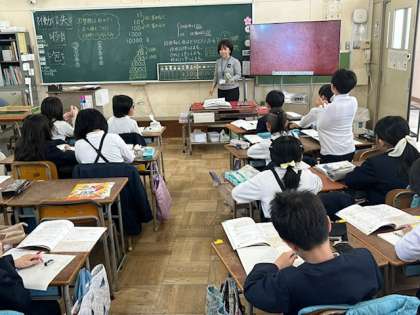 4年生、算数の時間です。10倍すると、どんな変化があるのだろうと、子どもたちが考え、見つけたことを発表していきます。「0が1つ増えます」「位が1つ増えます」。子どもたちの「発見」をひとつひとつ認め、褒めてもらえることで子どもは満足したように座ります。周りの子たちは(次は私を当ててほしいな)の気持ちで、挙げる腕もぐんっと伸びているようでした。
