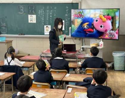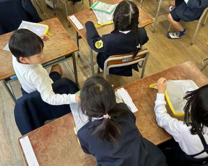 (先生、次は何をくばってくれるのかなぁ)子どもたちが待っています。机の上には、ちゃんと連絡袋のファスナーを開けて、準備オッケー。そして前の席の友だちから、後ろの席の友だちへ、「はい、どうぞ」「ありがとう」と言葉をかけ合いながら進んでいきます。短い言葉のやりとりですが、無言でやるのと比べれば、大違い。「ありがとう」がたくさん言える場面が、1日の中にたくさんあるのは、いいことですね。