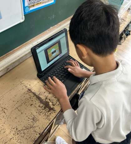 ?今日は昨日の雨で、運動場は水たまりがたくさんできていました。この子は「先生、見てみて!」とタブレットを出してタイピングの練習、というか、遊びながらカタカタとやって見せてくれました。・・・その指先の動きとすごいスピード!に「すっごいなぁ〜!」と私もでっかい声が出てしまいました。