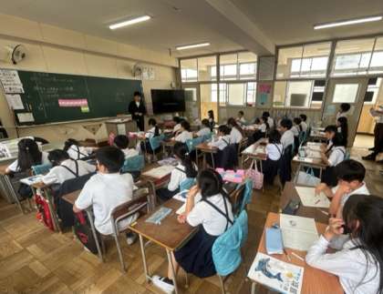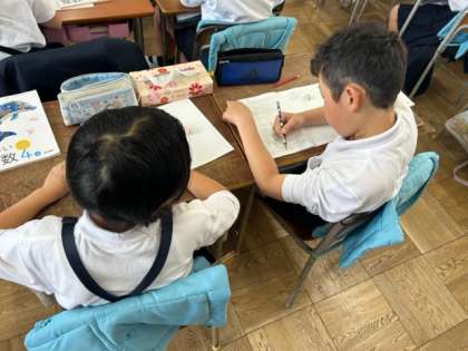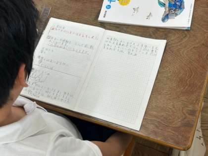算数の時間。今日は、式が72÷3になる学習の場面です。前時の80÷4の場面では、80を10のまとまりにすることから考え、答えを導いた子どもたち。今日も、図で表したり、言葉で書いたり。自分の考えをどう説明しようかと、自分なりにノートに表し、発表も頑張っていました。途中、友だちの発表を聞いて、少し言葉が足りないところは、周りの友だちがつないでいく場面もありましたね。そうやって少しずつ、みんなで「わかった」「できた」を積み重ねていきます。