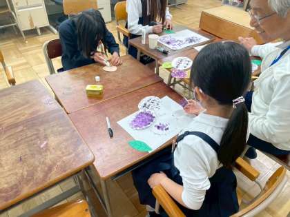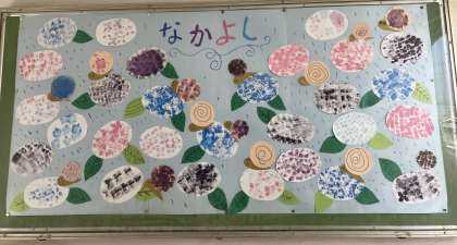 掲示板の制作ではアジサイを作りました。スポンジに絵の具をつけて、画用紙にポンポンとスタンピングしていきます。力加減を工夫しながら、綺麗な花を咲かせることができました。なかよし掲示板は家庭科室の前にあります。ご来校された際には、ぜひお立ち寄りください。