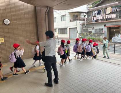 今日は1年生の校外学習です。心配された雨も、なんとか降らずでこの日を迎えました。ここまで、列で並んで歩くのも、電車の中で静かにするのもがんばっています。元気に、行ってきます!