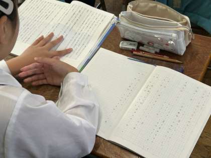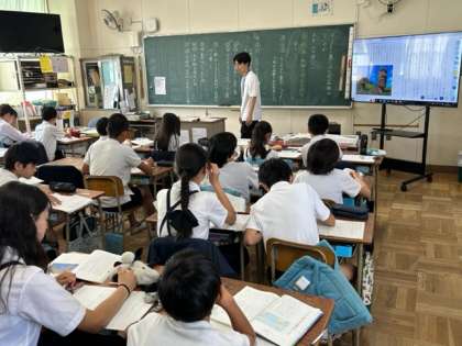 国語の時間です。本時のめあては「序論・本論の内容を読み取ろう」でした。黒板に先生が書いた内容を、自分なりにちょっと工夫して、わかりやすくノートにまとめている子どもたち。書けた人は、何も言われなくても自分で教科書をペラペラめくったり、前後のつながりやどこで論が分かれているかなど考えたり。先生と言葉を交わしている内容も、さすがは6年生だなぁと感心しました。