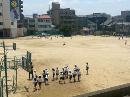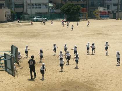 2年生の鬼ごっこがスタートしました。先に逃げた赤組の子どもたちが、さらに遠くへ散らばって行きます。今日は気候も良く、体育日和の1日。水分補給もはさみながら、元気いっぱい運動していました。