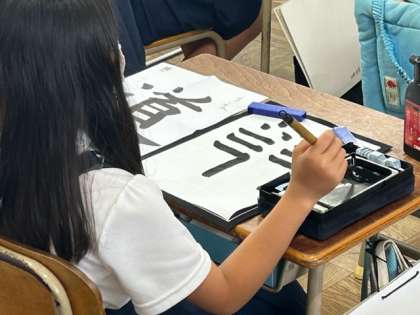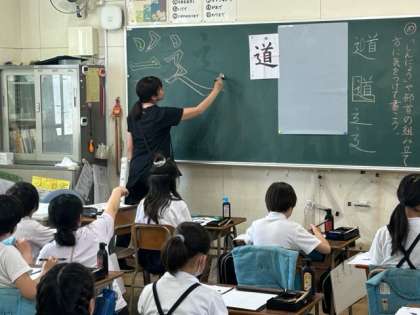 5年生、書写の時間です。今日のめあては「『しんにょう』や部首の組み立て方に気をつけて書こう」です。いきなり、「道」を書くのではなく、漢字のつくりや、始筆や曲げ、止め、はね、終筆など丁寧な指導があったことが、黒板や子どもたちの半紙に残された筆跡を見ると伝わってきます。この「しんにょう」は、小学校で書く文字のなかでも、なかなかバランスを取るのが難しい字ですが、果たして、子どもたちはこの難関にどう取り組んでいくのか、乞うご期待です。
