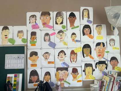 教室を覗くと、子どもたちの自画像が掲示されていました。よく見てかいたこと、色づくりにこだわったこと、筆の使い方を工夫したこと、自分がつくった肌の色や髪の色を丁寧に大事に置いていったこと。ちゃんと伝わってきましたよ。「今しか描けない絵」が、育和の教室に、廊下に、階段に掲示されています。