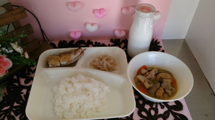 本日の給食は、「ご飯、さんまのみぞれかけ、鶏肉と野菜の煮もの、もやしのあえもの、牛乳」でした。