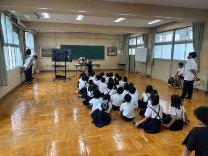 月曜日、今週の全校朝会はリモートで行われました。テレビの調子が良くない教室がひとつあり、そのクラスの子どもたちは、まるでスタジオ収録のような感じで、多目的室に集まってくれました。新しい友だちの紹介に拍手をしたり、先生や委員会のお兄さんたちからのお話をしっかり聞いたり。朝からがんばりましたね。