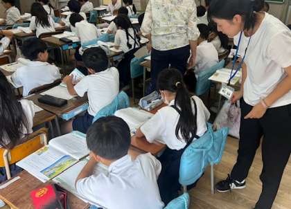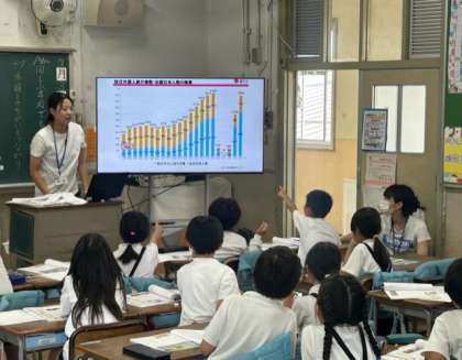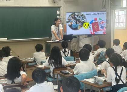 道徳の時間です。今回の学習は「同じ小学校でも」という題材。日本と外国の小学校の同じところや違うところについて考えていきます。担当の先生は子どもたちが少しでも興味を持って学習にのぞめるようにと、授業の導入で、自身が撮影した外国の様子を見せてくれました。教科書を読んで気づいたことを発表する場面では、外国の小学校の中には、当番活動がなかったり、帰る時間が全学年同じだったり等があり、日本との違いに「へ〜、そうなんや!」と感心したり、グラフを見て驚いたりする様子がありました。さらに、日本の中にある外国の文化、外国の中にある日本の文化についても話し合い、発表していきました。