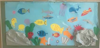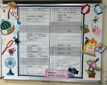 1学期も残すところ、あと2週間となりました。子どもたちも、学習のまとめに向けて、勉強に遊びにとがんばっています。下の写真は、掲示委員会の子どもたちが作ってくれた今月の掲示物です。暑い毎日ですが、この前に立つと、「育和水族館」のかわいい海の生き物たちに癒されます。