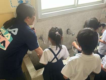 先程の鍵盤ハーモニカの練習のあと、手洗い場に並んで、吹き口とホースの洗い方を習っていました。われ先に、ではなく、ちゃんと並んで前の人の様子を見ながら順番を待てていました。1年生、成長してきましたねぇ。
