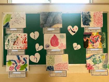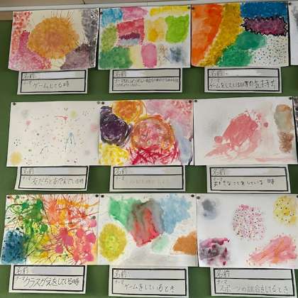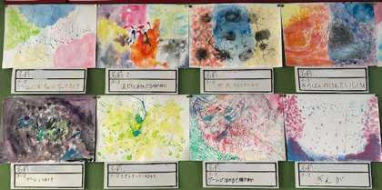 ?心の中で思い浮かんだ気持ちや場面。5年生の図画工作で取り組んだ作品の数々です。ひとつの色に他の色や水を少しずつ足して描いたり、たくさんの気持ちが響き合うように色を重ねたり。最初は作品だけを観ていろいろ想像して、次に作品の下にある子どもたちのテーマを見て、そしてもう一度鑑賞すると、その子の気持ちに少し寄り添えたような、そんな気がします。