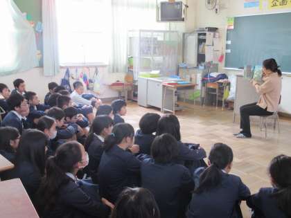 26日(金)の朝の時間、カラフルBOOKちゃんの読み聞かせがありました。