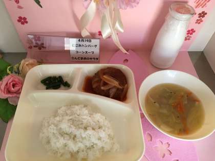 本日の給食の「ご飯、煮込みハンバーグ、コーンスープ、三度豆のサラダ、牛乳」でした。