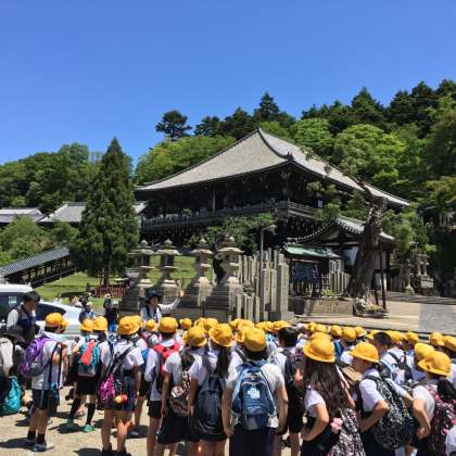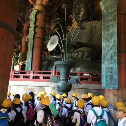 5月13日(金)5年生は、奈良公園へ遠足に行きました。はじめに、奈良公園を通って東大寺へ行き、大仏を見学しました。そして、二月堂へ登り、春日野園地でお弁当やおやつを食べました。それから、芝生の上で鬼ごっこやかくれんぼなどをして思い切り遊びました。奈良公園や東大寺は、ものすごくたくさんの人でにぎわっていましたが、鹿も見ることができ、とても楽しい思い出に残る楽しい遠足になりました。