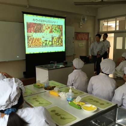 6月9日(木)5年生を対象にキウイフルーツの食べ比べの体験をしました。東部市場の方や販売の方などたくさんの方に来ていただいて、キウイの生産されているニュージーランドのことやキウイの栄養、おいしい食べ方などについていろいろ教えていただきました。その後、グリーンキウイとサンゴールドキウイを食べ比べました。どっちもとってもおいしかったです!来ていただきました皆様ありがとうございました。