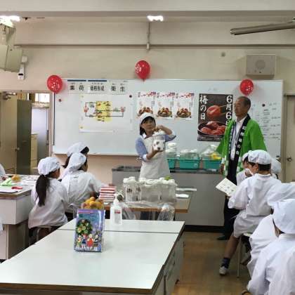 6月14日(火)東部市場の方や和歌山県田辺市の梅の生産者の方に来ていただき、4年生を対象に梅ジュースの作り方を教えてもらいました。育和小学校で8年ほど前から続いているイベントです。冷凍梅とさとうを大きなびんにつめ、1週間ほどねかせたら完成です。作業の後、子ども達は、特別に前に作っていただいていた梅ジュースを試飲させてもらいました。甘酸っぱくてとてもおいしかったです。できあがりがとても楽しみです。お越しいただいた皆様、本当にありがとうございました。