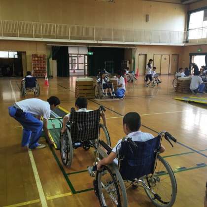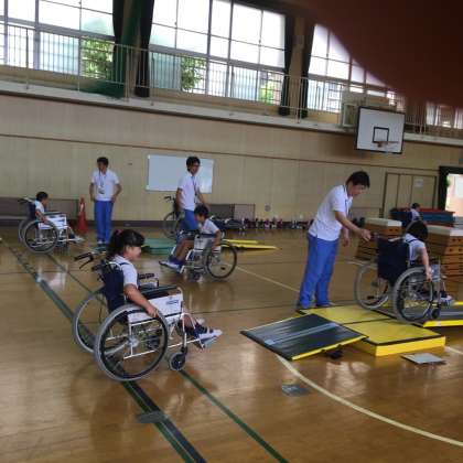 6月15日(水)3年生は、大阪市立心身障がい者リハビリテーションセンターの方に来ていただいて車いす体験学習を行いました。これは、車いすに実際に乗る・押すなどの体験を通じ、車いすを利用する人の気持ちを体感することで、相手の立場を考え行動する力を育てること、まちのバリアフリーや障害に対して理解を深めることを目的としています。体験を終えて子ども達は、「思ったよりも車いすが重かったので、段差や坂道で押すのが、難しかった。」「乗ってみると段差やでこぼこの道では振動が大きくなったり、坂道では体が急に傾いたりして怖かった。でも、友だちが声をかけてくれると安心して乗ることができた。」などと話していました。