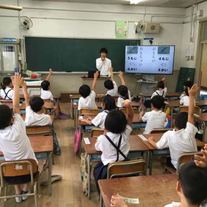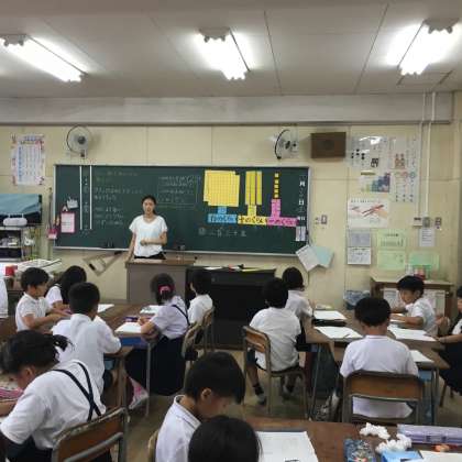 6月24日(金)2時間目に1年2組で国語科の研究授業が行われました。「ねじれるおとのことば」という単元で小さい「や」「ゆ」「よ」といった拗音についての学習でした。子どもたちは、とても楽しそうに学習に取り組んでいました。3時間目には2年3組で算数科の「100より大きい数をしらべよう」という授業がありました。子どもたちは、10のまとまり考えればよいことに自然と気づいていきました。授業の後、大阪市教育センターの河野先生から授業の進め方についての指導をしていただきました。