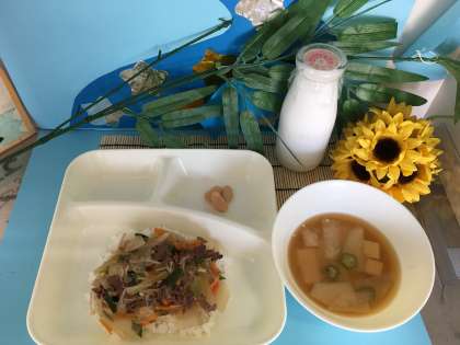 「牛丼」は、牛肉、糸こんにゃく、たまねぎ、にんじん等を甘辛く味つけした子ども達に好評な献立です。青ねぎを斜め切りにすることで、緑の色合いがよりはっっきりするようにしています。