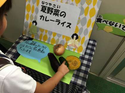 「夏野菜のカレーライス」は、じゃがいもを使わずに夏野菜のかぼちゃ、なす、トマト(缶)、ピーマンを使っています。カレー味にすることで夏野菜をたくさん食べることができます。