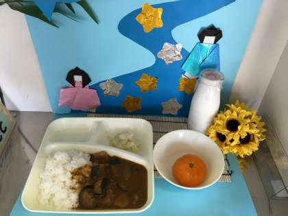 本日の給食は、「夏野菜のカレーライス、キャベツのサラダ、みかん(冷)、牛乳」でした。