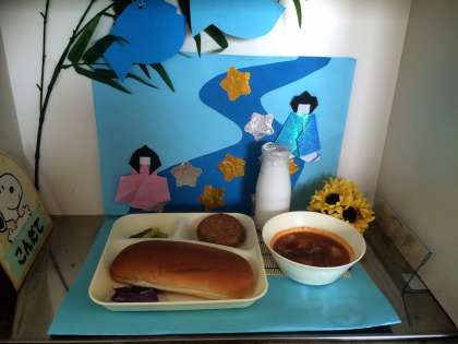本日の給食は、「牛乳、コッペパン、ブルーベリージャム、チキンレバーカツ、ケチャップ煮、グリーンアスパラガスのサラダ」でした。