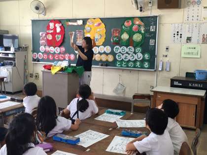 本日の給食の食材を使って、2年生で食べ物のはたらきについての食育指導をしました。