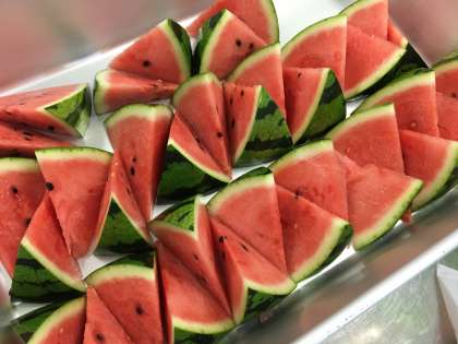 給食室では、調理員さんがすいかを1/64に切り分けてくださいました。