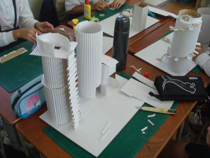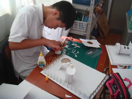 白と茶色のダンボールを使って、建物を作っていきます。円柱や直方体の形で基本となる建物を作った後は、思い思いの飾りをしていきます。波型ダンボールを丸めて飾りを作ったり、ダンボールを合わせていき、階段にしたり、想像したことが少しずつ形になっていきます。ダンボールを器用に切り、小さなテーブルやいすを作る人もいました。またブランコやシーソーなどの遊具もありました。見ていると、まるで小人が住む家のように感じられました。