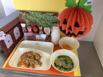 「ピリ辛丼」は、豚肉を主材に、たまねぎ、たけのこなどの野菜を使った丼です。しょうが、にんにく、トウバンジャンで香りと辛みをつけています。