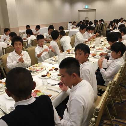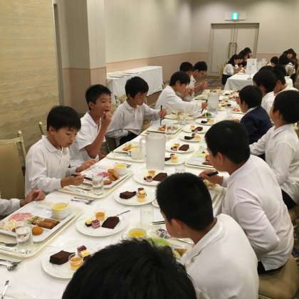 自分の食べたい料理をお皿に入れ友だちと楽しく食事をしています。