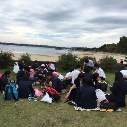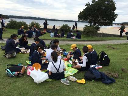 シーカヤックと磯体験を終え、芝生広場でお弁当を食べています。この後、集合写真をとってから学校に向かいます。